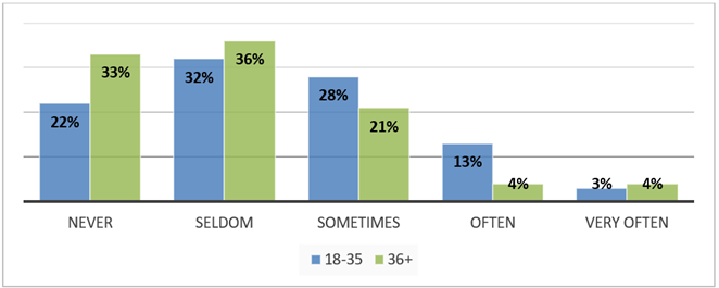divided into two age groups: 18-35 years (n 67) and 36+ years (n 68), with a